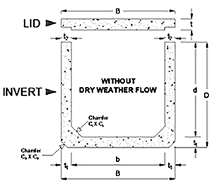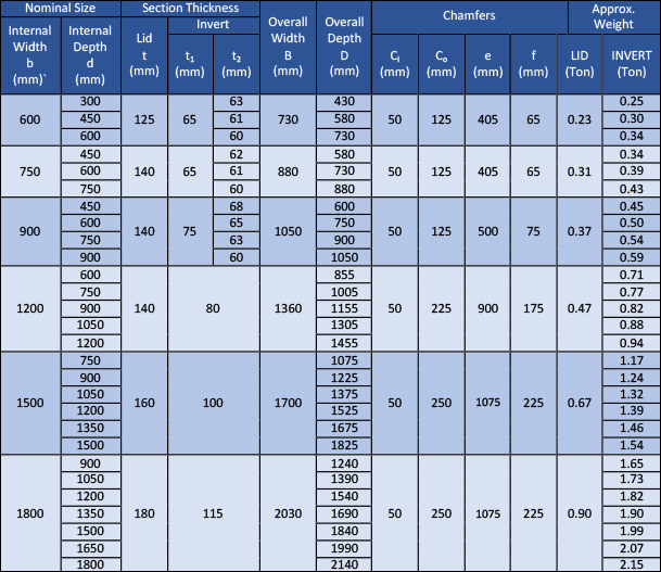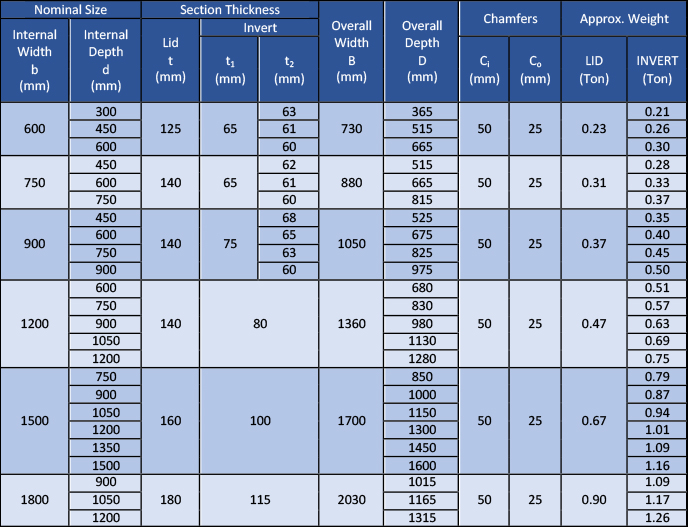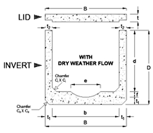 CE Box Culverts are available in Standard Size [for nominal width between 600mm and 1800mm] in the length of 1 meter as shown in the Table. CE Box Culverts are available in both WITH and WITHOUT Dry Weather Flow channels.